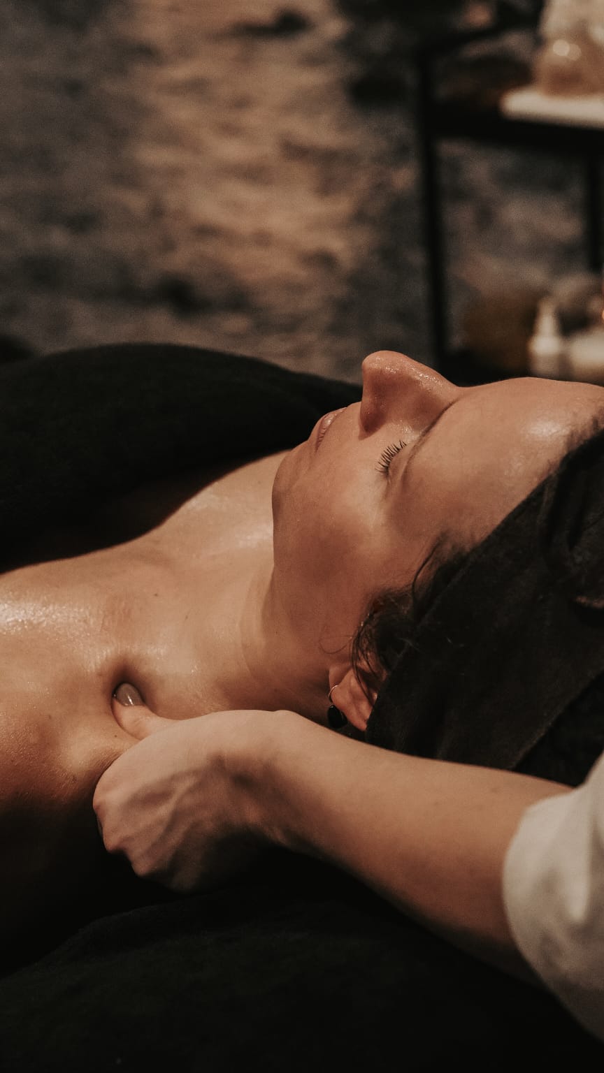 We starten met een heerlijk warm nek kompres en een korte decolleté-massage om spanning los te laten. Daarna volgt een dubbele reiniging en een zachte scrub die je huid laat stralen.